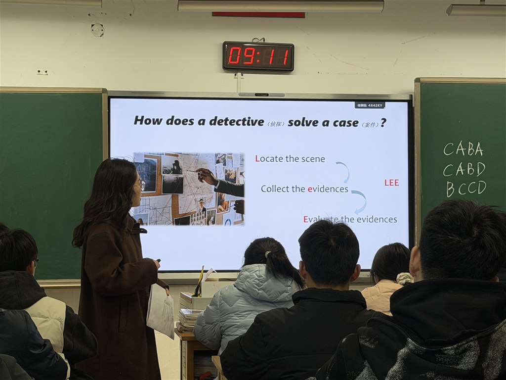 2025年12月3日,高三(5)班戴丫丫老师以“高考英语中的选项思维与证据评估”为主题,成功开设了一节生动而富有深度的公开课。课堂选用2024年、2025年高考英语全国一卷中的三篇阅读理解作为素材,直指当前高三学生在英语阅读中存在的普遍问题——缺乏定位意识、答案选择随意等现象。 为有效改善这一现状,戴老师将解题思维可视化,为学生搭建清晰的思路支架。本节课旨在引导学生养成三个关键意识:第一,是否准确定位;第二,是否找到答案句;第三,能否识别错误选项并确立正确选项的依据。 课堂以情境创设开启:“如果你是侦探,如何破解案件?”自然引出本节课的核心任务——“如果你是阅读侦探,如何破解每一道题?”戴老师自创的“LEE法”(定位-证据-评估)逐步展开讲解,引导学生对每个选项进行错误归因,深化他们对文本和题目的理解。 在两篇阅读讲解结束后,戴老师回归导入环节的问题,实现教学闭环,鼓励学生自主总结阅读方法。最后的产出环节,学生运用“侦察思维”(即LEE法)独立解题,并向同桌讲解自己的思路,真正实现了从理解到输出的跨越。 在评课环节,北郊高中徐美玲老师对本节课给予了充分肯定。她认为课堂思维脉络清晰、教学目标达成度高、师生互动氛围融洽。同时,她也提出了宝贵的改进建议,强调课堂容量需进一步贴合学生的实际认知水平,以提升教学节奏的适切性。